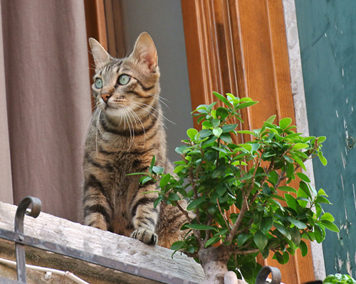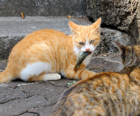Macchina fotografica alla mano ebbi la fortuna di immortalare un’abile pesca e successiva colazione del gatto bianco e rosso della foto, difesa ad oltranza dall'attacco sferrato dalla gatta dal mantello tartaruga, che tentò invano di sottrargliela.